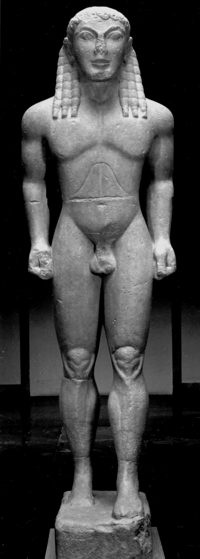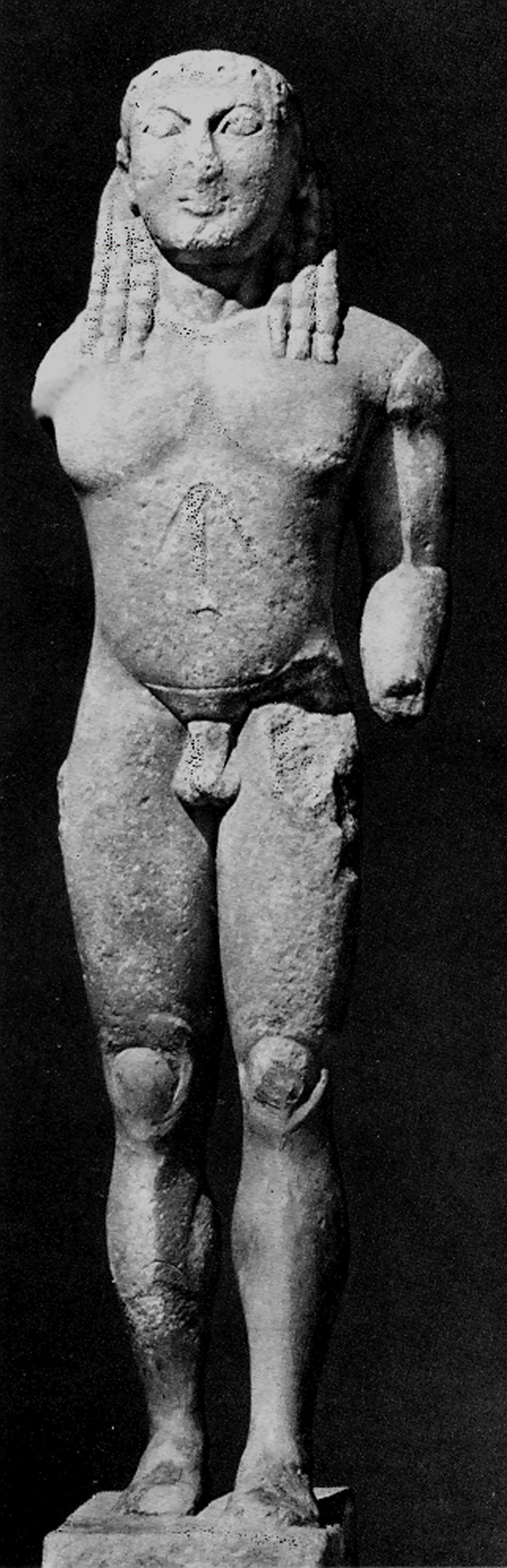 Als Kleobis wird gewöhnlich der im Abguß vorliegende, besser erhaltene der beiden Kuroi bezeichnet. Nur die Füße mit einem Teil der Unterschenkel fehlen. Ob die Füße in weichen Lederstiefeln steckend zu ergänzen sind, muß fraglich bleiben. Nicht sicher ist auch, ob zu diesem Kleobis die jetzt mit ihm verbundene Standplatte ursprünglich gehörte, denn die Figuren weisen dieselben