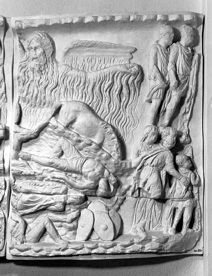 (Die von den Feinden in einem Kessel eingeschlossenen Römer werden durch einen Platzregen vor der Ausdörrung bewahrt und können so dennoch den Sieg gegen die Barbaren erringen.)