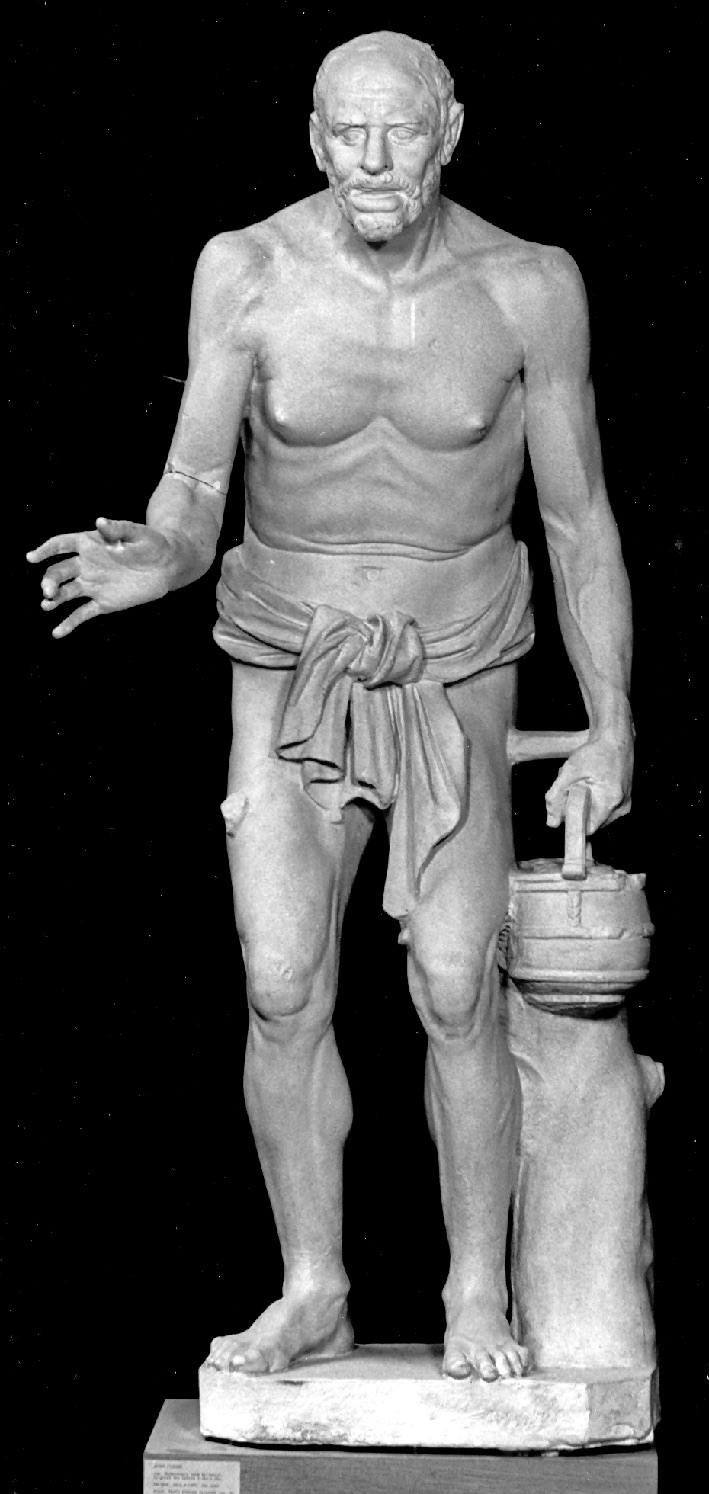 Die vollständigste Vorstellung vom hel­lenistischen Urbild gewinnen wir durch die Replik im Vatikan. Etwas verfäl­schend wirkt nur die ergänzte rechte Hand, die in Wirklichkeit wohl eine Angel umfaßte, und das länglich ergänz­te Untergesicht. Die beiden die Scham bede­ckenden Enden des Schurzes wurden von einem Ergänzer des Vatikan in Stuck hinzugefügt. Bei der Kopie im Louvre sind Arme und Beine und das Hüfttuch ergänzt. Die Form des Gesich­tes gibt diese Replik richtig wieder.
