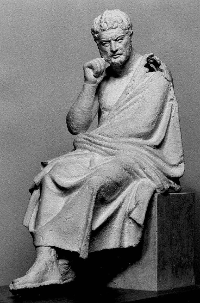 Die Statuette ist eine von insgesamt fünf, nahezu gleichgroßen Repliken, die unter Archäologen stets die Vermutung auslösten, bei dem Dargestellten müsse es sich um eine bekannte Persönlichkeit handeln. Das verlorene Original wird wohl lebensgroß gewesen sein. Deren Identifizierung mit einem berühmten Philosophen wurde denn auch immer wieder versucht. Wesentliche Anhaltspunkte ihrer Benennung lieferte dabei die mit Kopf fast vollständig erhaltene Bronzereplik in London, in der man die Stoiker Zenon oder Kleanthes erkennen wollte. Der längere und auffälligere Mantel jedoch erinnerte K. Fittschen jüngst an die Statuen der Epikureer.